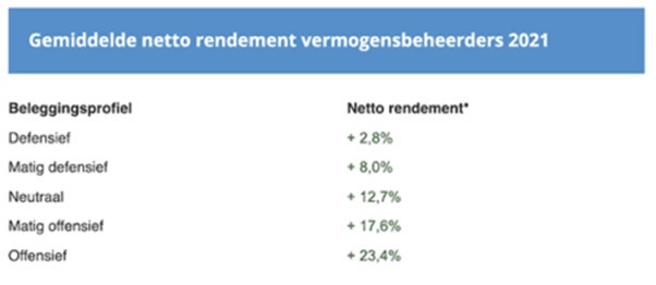 Vermogensbeheerders met de meer risicovolle offensieve beleggingsportefeuilles, realiseerden het hoogste rendement met een gemiddelde stijging van 23,4%. Een matig offensief profiel liet een mooie plus van 17,6% zien. Het meest defensieve risicomijdende profiel noteerde de laagste stijging: 2,8%. Een verschil van ruim 20%. Voor klanten met een neutraal beleggingsprofiel, bestaand uit zowel aandelen als vastrentende waarden zoals obligaties, realiseerden vermogensbeheerders 12,7% netto rendement. Dit was in 2018 gemiddeld -5,5%, in 2019 15,8% meer en in het zeer wisselvallige ‘coronajaar’ 2020 plus 3,1%.